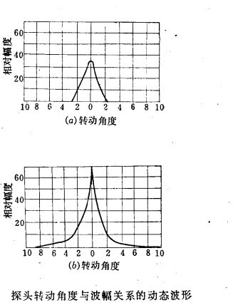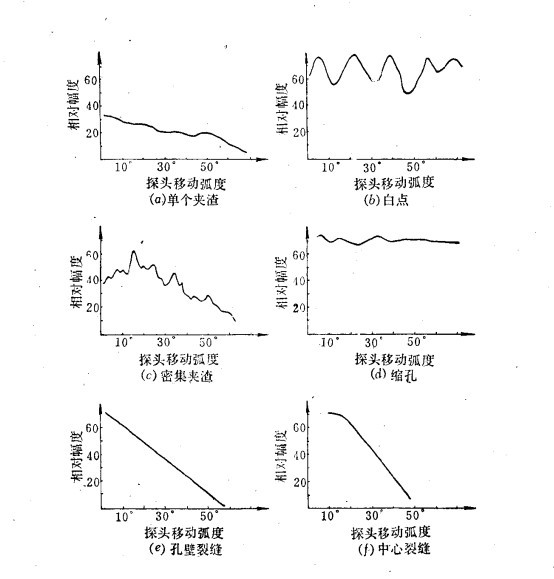 3.探頭轉動角度與波幅關系的動態波形圖 這種波形圖 用斜探頭測繪出,適用于平面工件中具有垂直或傾斜方向缺陷的定性。下圖所示為單個點缺陷和線狀缺陷的動態波形圖。從圖中看出單個而較小的點狀缺陷,探頭稍微轉動,則缺陷波立即消失。而線狀缺陷(如裂紋),其缺陷波幅隨探頭轉動角度的增大而下降直至消失。所謂轉動角度,系指發現缺陷波的最大值處為零,再將斜探頭轉動至缺陷波消失,則波束中心線與缺陷波最大值時的夾角。