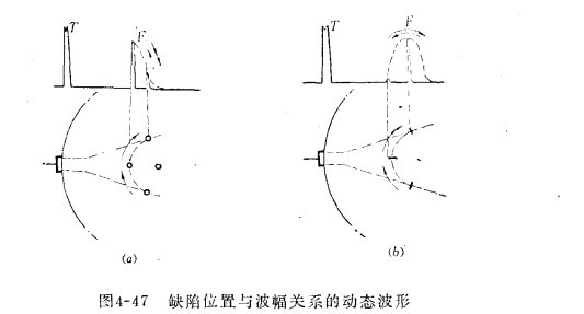 4.缺陷波位置與波幅關系的動態波形圖 這種波形圖用超聲波探傷儀直探頭測繪,適用于游動訊號缺陷的定性。下圖所示為徑向裂紋和立體形缺陷的波形圖。