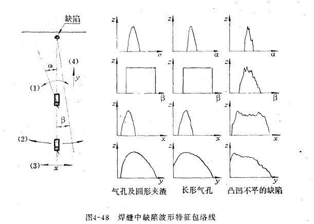 5.焊縫中缺陷的動態波形圖 焊縫中缺陷的方向和形狀,可根據探頭移動或轉動時,波形連續變化的包絡線,來判定缺陷的類型。探測焊縫時,探頭移動的方式及其所形成的包絡線,如下圖