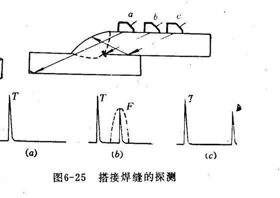 二、搭接焊縫探傷 搭接焊縫探傷可用下圖方法所示,探頭在c位置時,熒光屏上出現焊角反射波。當探頭向焊縫方向移動,聲波遇到缺陷時,將出現缺陷波。超聲波探傷儀探頭在b位置時,缺陷波最大,探頭由b向前移動時,缺陷波幅逐漸降低(缺陷波位置前移)。探頭在a位置時,聲波透過焊縫,在下部板中傳播,熒光屏上無射波。